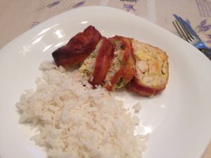 A baconnel kibélelünk egy őzgerincformát, úgy, hogy túllógjon a széleken a szalonna, hogy rá lehessen majd hajtani a forma tetejére. A csirkemellet felkockázzuk, sózzuk, borsozzuk. A tejfölt/rizskrémet kikeverjük a tojásokkal, a sajttal, liszttel és az aprított friss fűszernövényekkel. Ezután beleforgatjuk alaposan a csirkemell kockákat. Az egészet beleöntjük az őzgerinc formába, visszahajtuk rá a bacont és betesszük 180 fokos sütőbe 50 percig sülni. Amikor megsült a husi, kiborítjuk óvatosan egy tepsire és visszatesszük még 5-10 percre a sütőbe, hogy a tetején is megpiruljon a bacon.