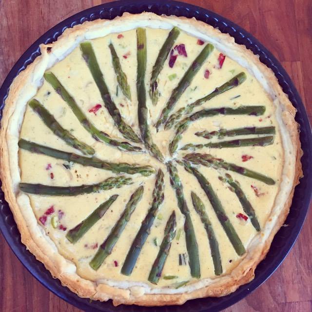 Egy tálban a tojásokat, krémsajtot, tejszínt összekeverem, mehet bele a sajt, bacon, hagyma ( és ha spenóttal csinálod, akkor az is), ezt ráöntöm az elősütött tésztára és arra teszem a spárga darabokat, mehet a sütőbe 200-220 fokra tűpróbáig. (Ha kicsit remegős marad sem gond, megszilárdul, mire kihűl.)